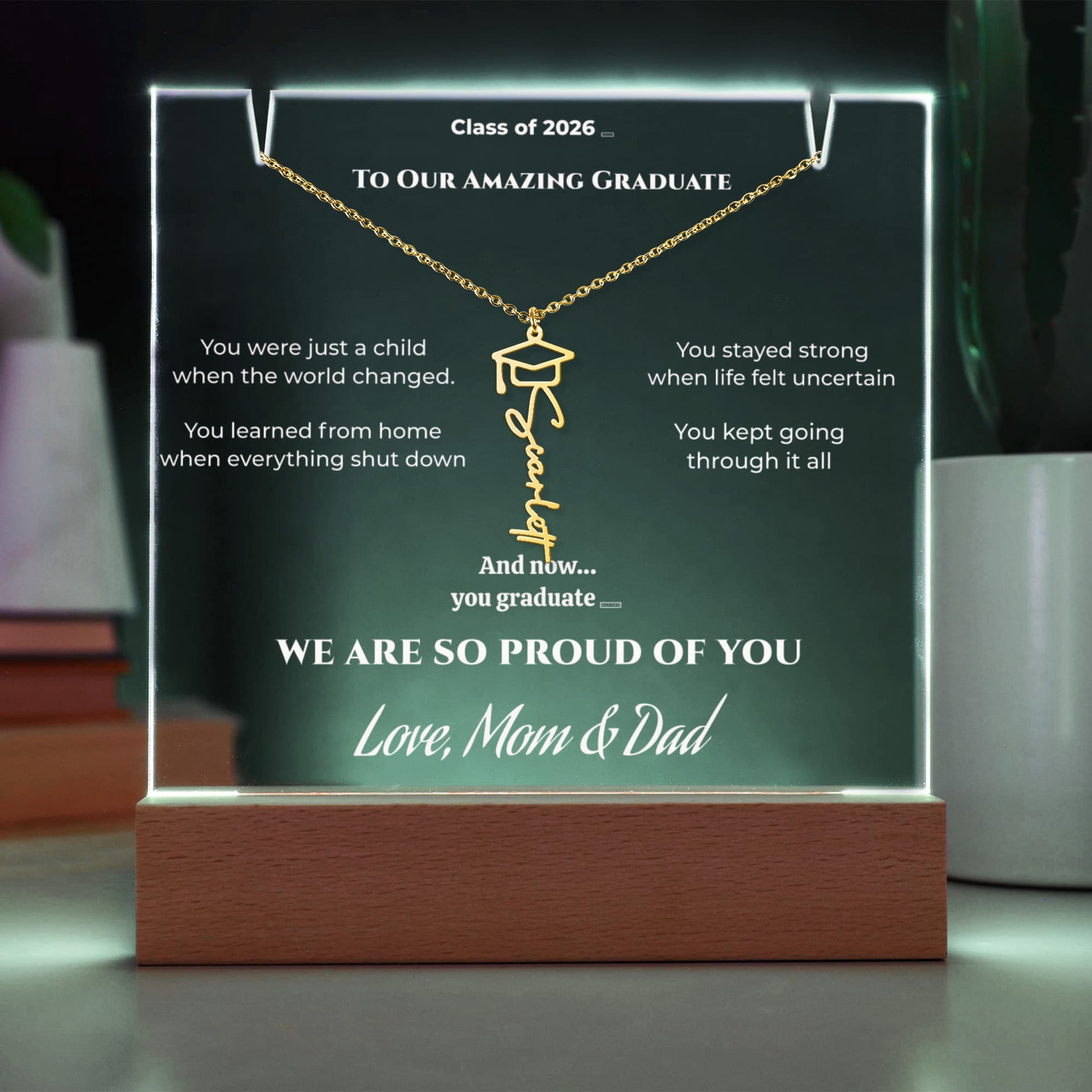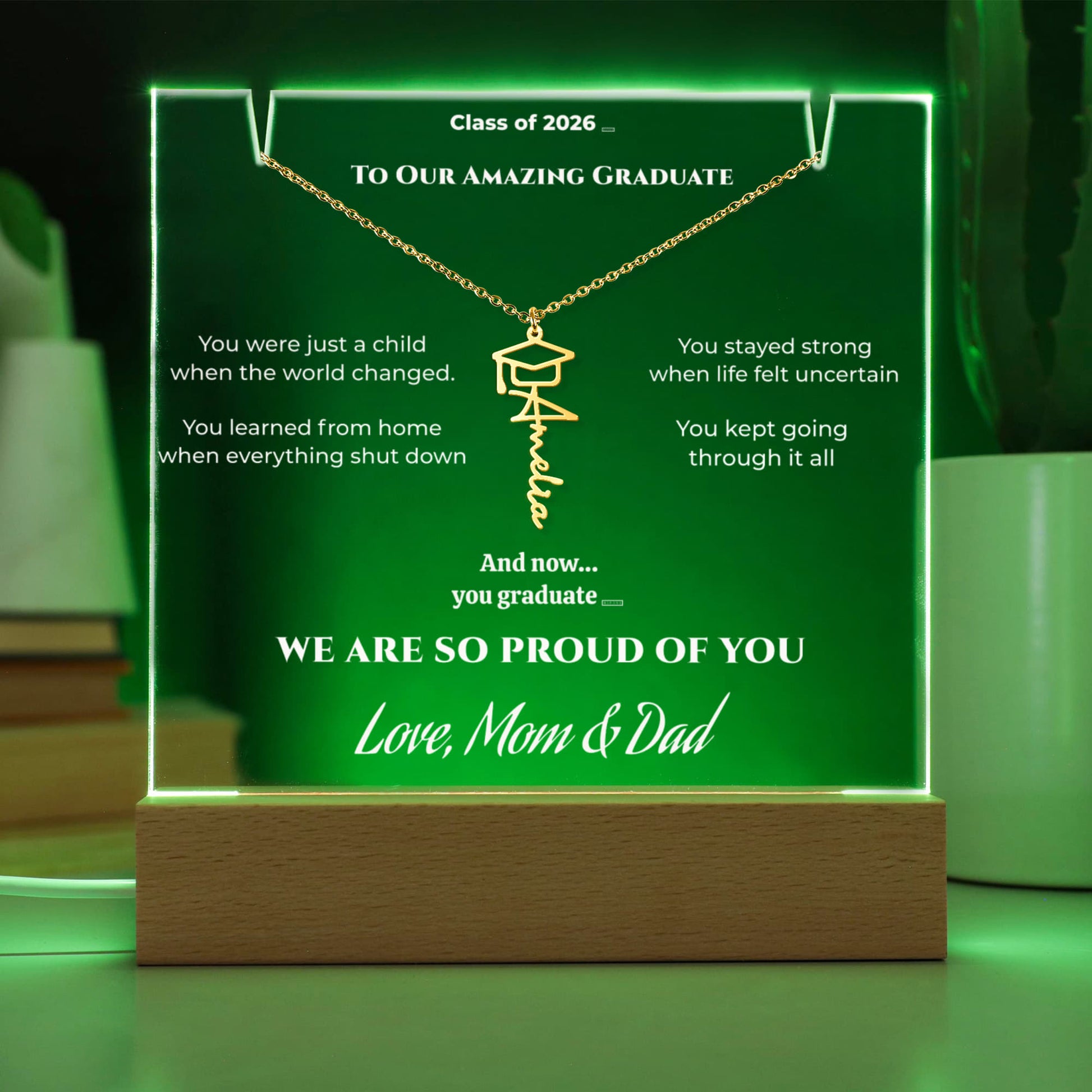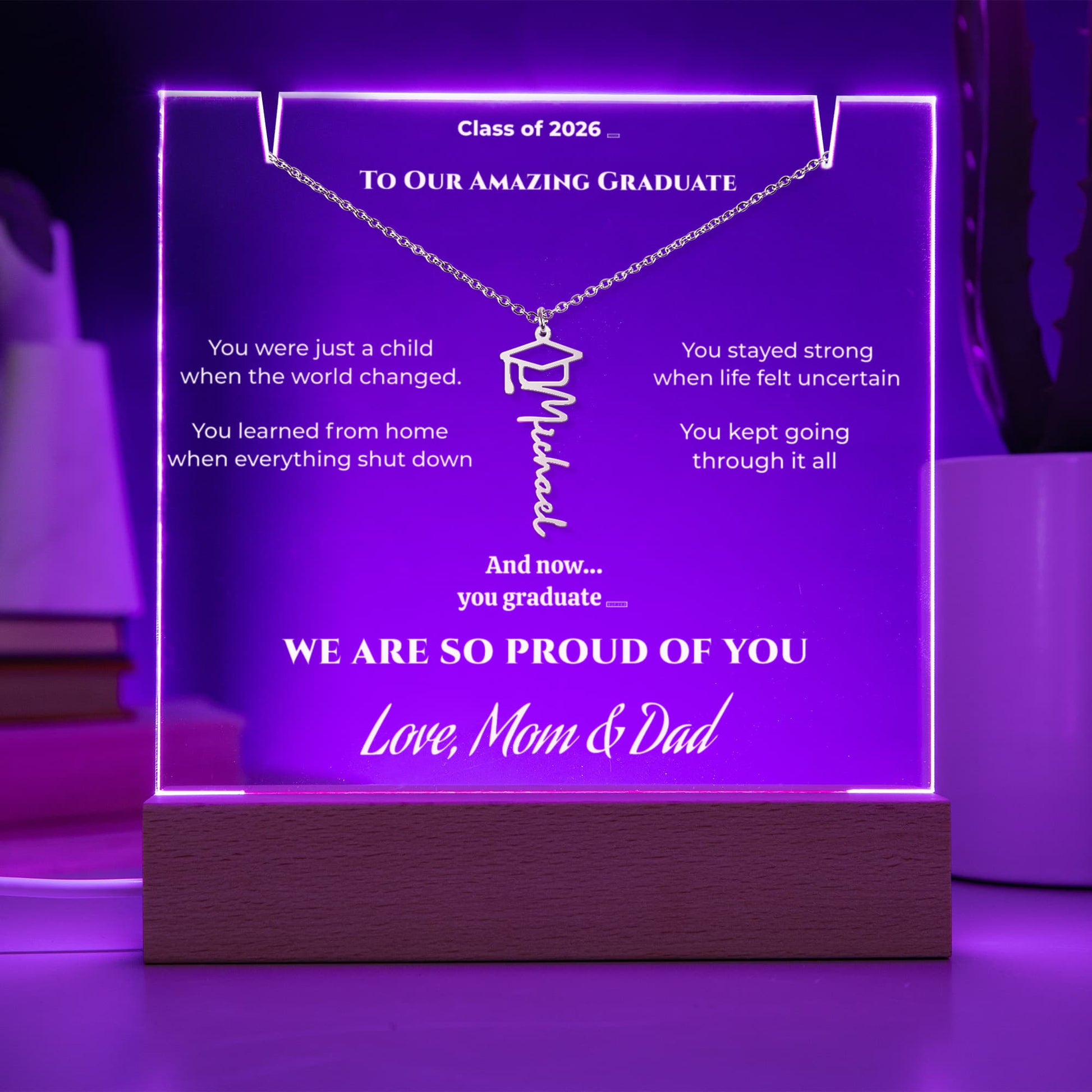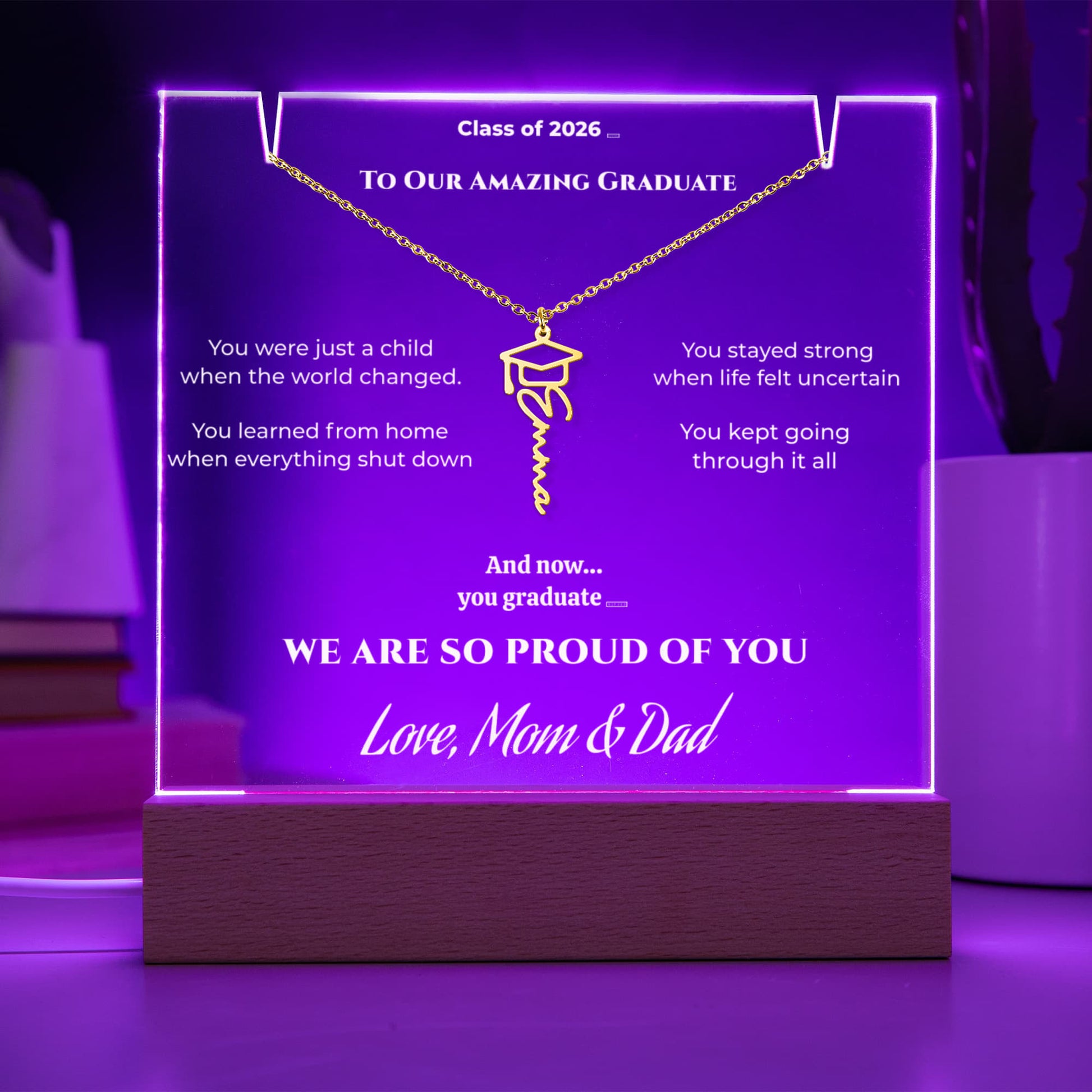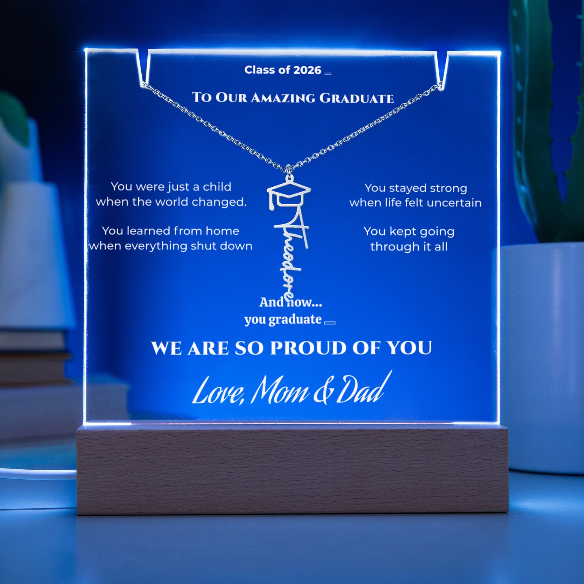 This beautiful keepsake combines a personalised graduation necklace with a glowing acrylic display —